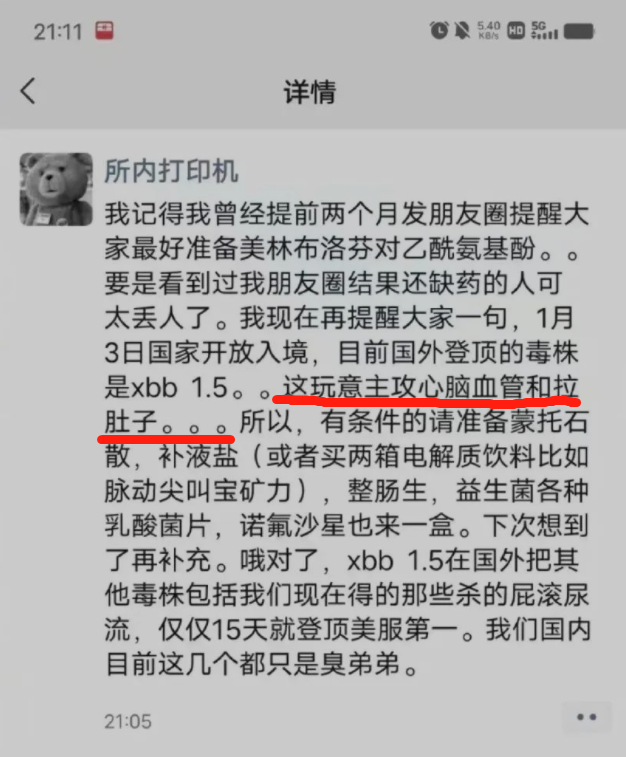 一位黑白泰迪熊头像的网友发文称,XBB.1.5主攻心脑血管,并会引发拉肚子,建议大家准备蒙脱石散、诺氟沙星、补液盐、整肠生、益生菌等。还称跟XBB.1.5比起来,目前在我国流行的毒株都是“臭弟弟”。