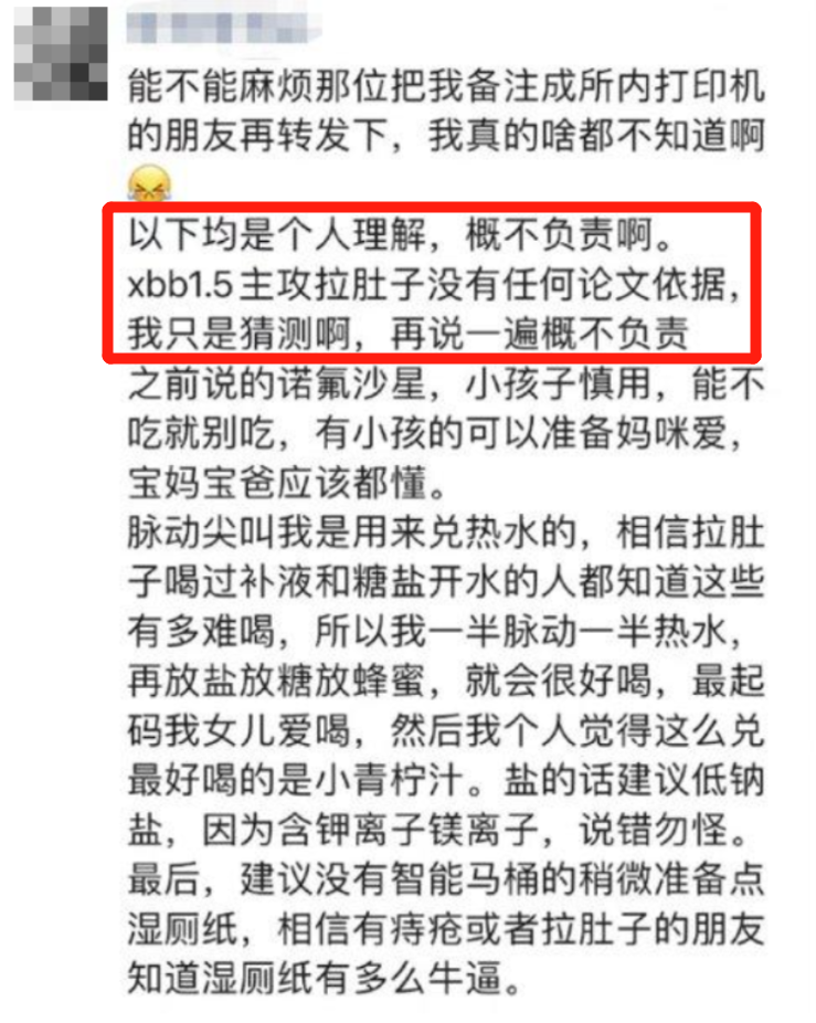 还有网友称,“北京、上海已出现XBB病例”,感染之后会“大便失禁”,呼吁大家囤积点纸尿裤。