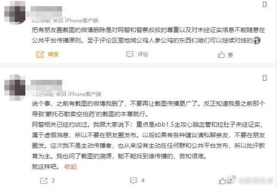 “手机朋友圈的内容全部拍照留档了,民警表示,重点是XBB1.5主攻心脑血管和拉肚子未经证实,属于虚假消息,所以不要在朋友圈发布。”