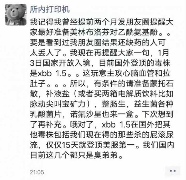 12月31日晚上,一张“关于XBB1.5毒株在美国登顶,大家要屯点蒙脱石散、整肠生、诺氟沙星”的朋友圈截图突然流传,不少药物一度脱销,一时间“蒙脱石散”“诺氟沙星是什么药”等多个相关话题冲上热搜。截图疯传的结果,直接导致新年的这两天,国内多地药店蒙脱石散卖断货。