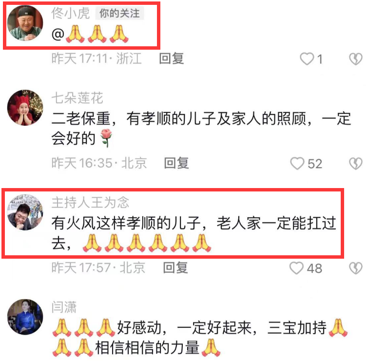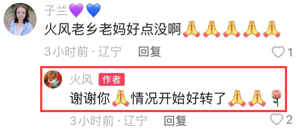 经过一夜的抢救,火风母亲的病情终于好转了一点,评论区也有不少圈内人士留言鼓励,祈祷老人可以早日转危为安。