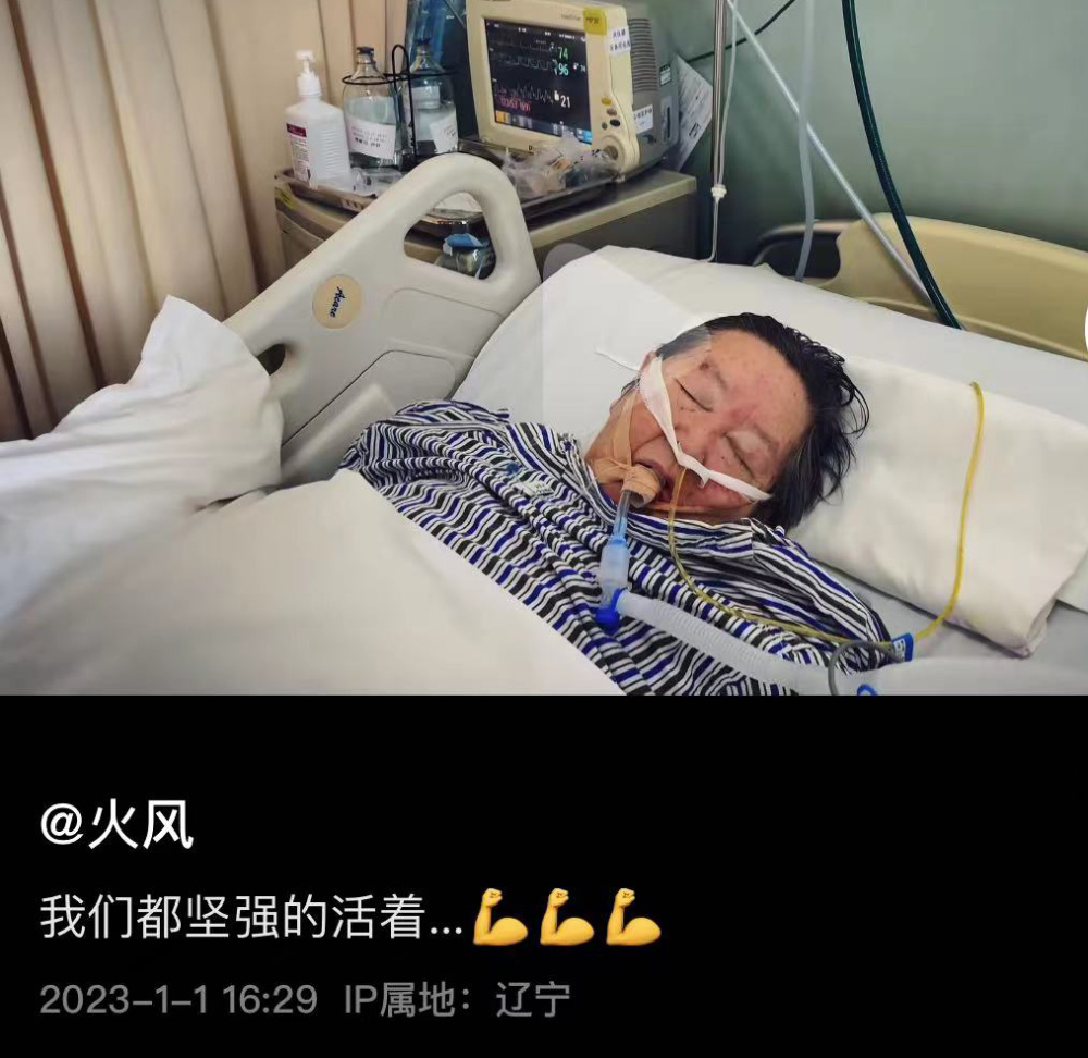 1月1日,老牌艺人火风更新动态,晒出了自己母亲躺在病榻上抢救的动态,从照片来看,火风母亲看上去状态堪忧,医院已经安排上辅助呼吸的设备对其予以救治,火风在视频中还配文:“我们都坚强地活着”,给予母亲祈祷。